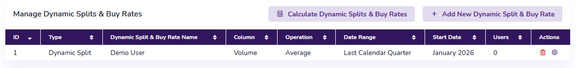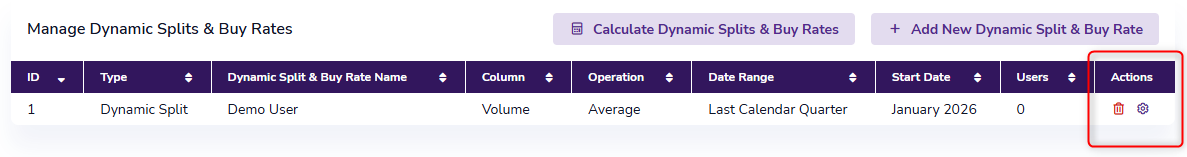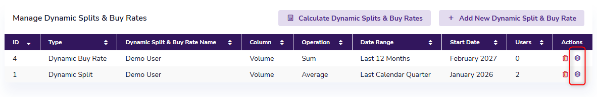 To assign a Dynamic Split or Buy Rate, click the gear icon in the Actions column for the desired configuration.