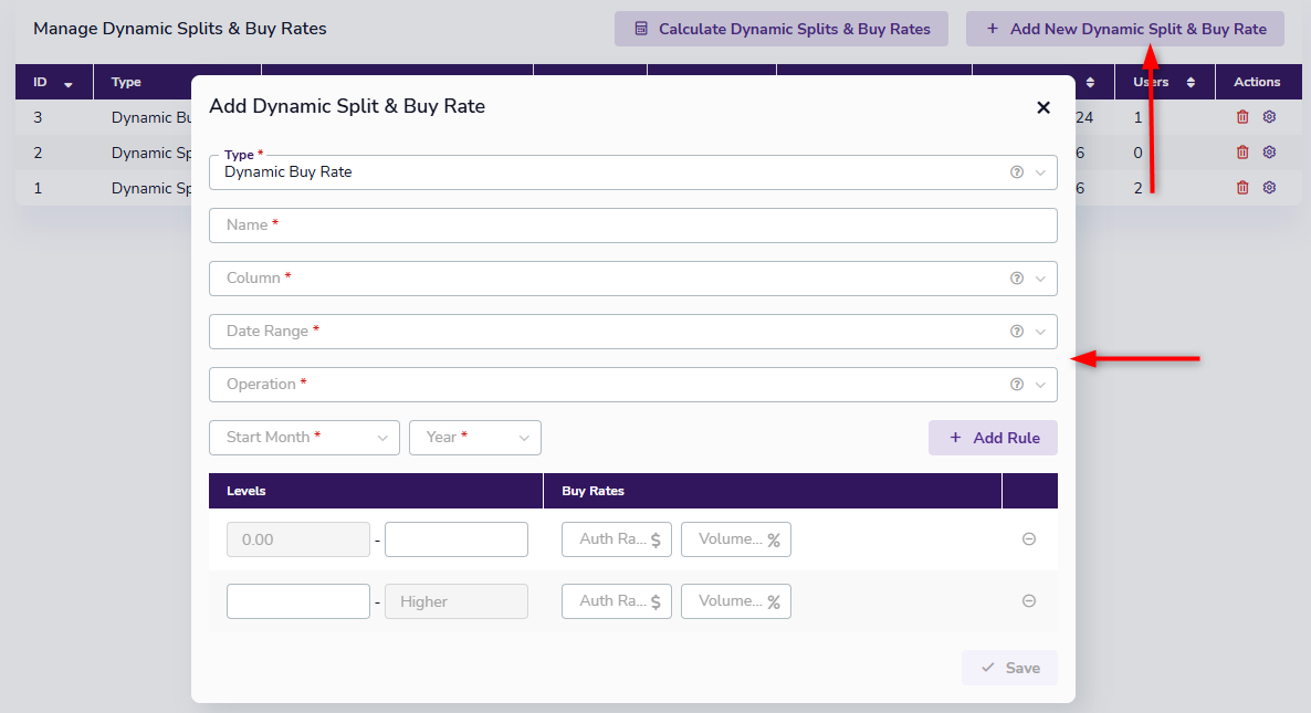 From the Dynamic Splits page, click Add New Dynamic Split & Buy Rate to open the configuration window.