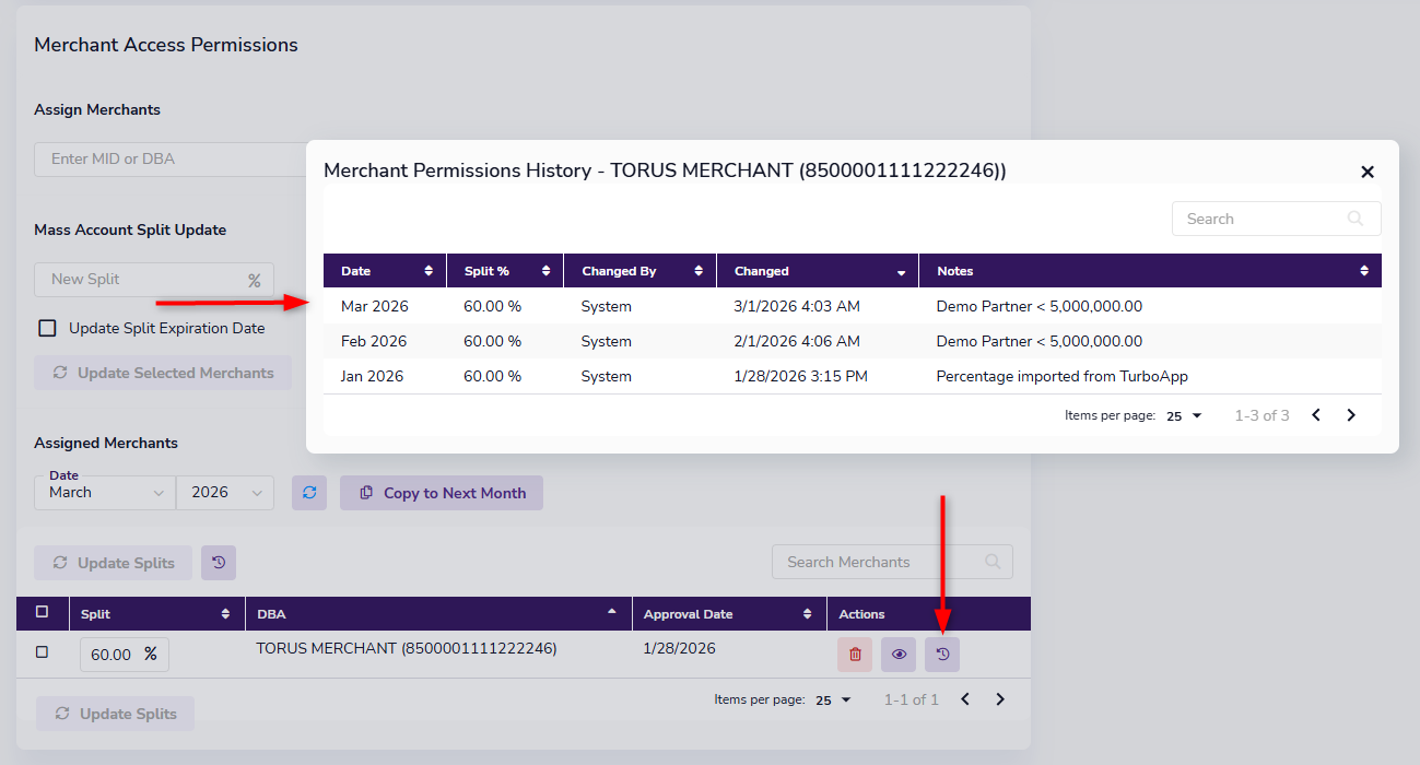 Dynamic Split and Buy Rate assignments, including assignment history, can be viewed on the user settings page under the Merchant Access Permissions section.