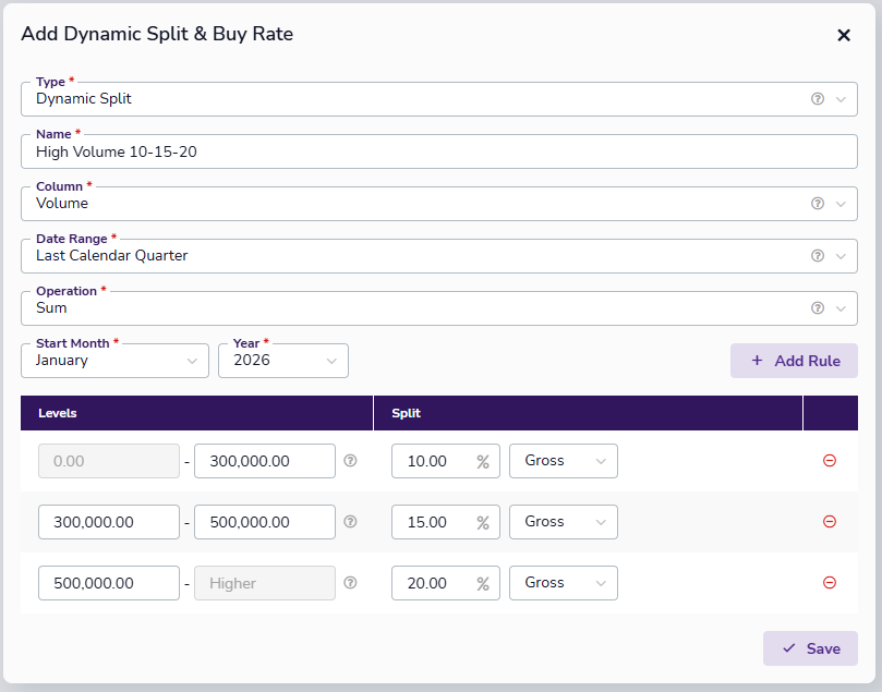 - Define threshold tiers by entering the performance range and corresponding split percentage (Net or Gross). Click Add Rule to create additional tiers.