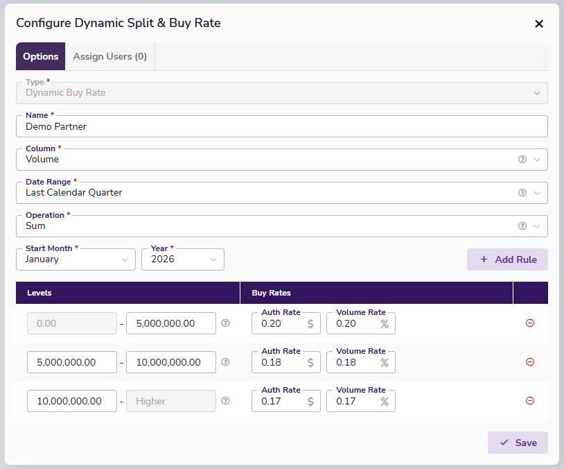 - Dynamic Buy Rates apply tiered buy rates (Auth Rate and Volume Rate) based on portfolio metrics such as Total Payment Volume (TPV) or transaction count.