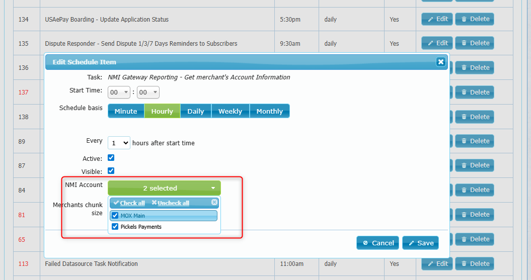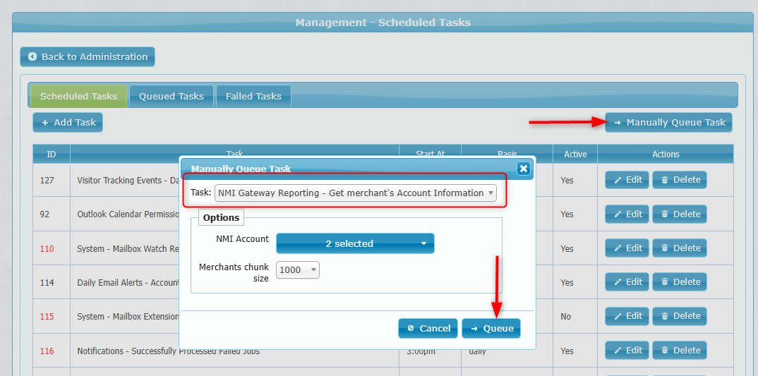 The NMI Gateway Reporting Scheduled Task pulls merchant data from the gateway on a set schedule so the Merchant Portal can display up-to-date merchant information.