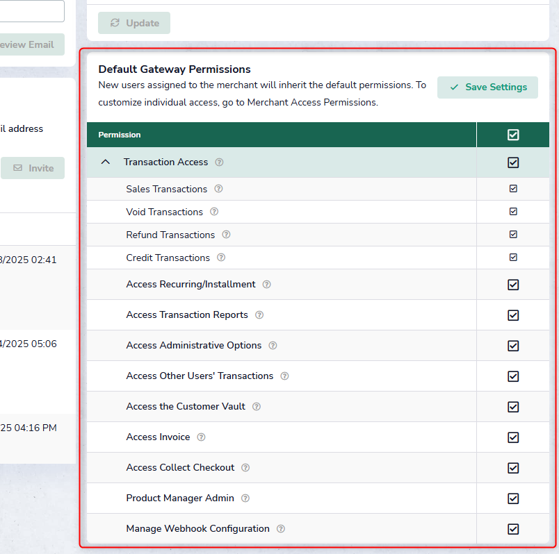 Default permissions are automatically applied to new users under a merchant. This helps ensure consistent access based on the merchant’s needs.