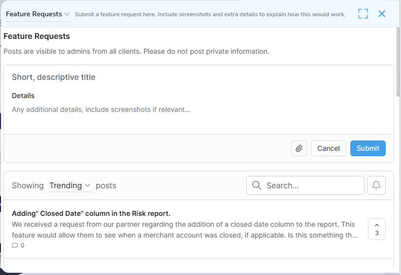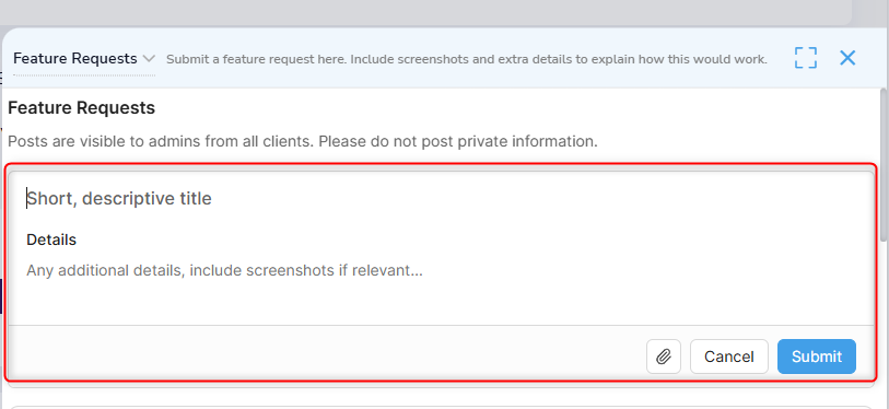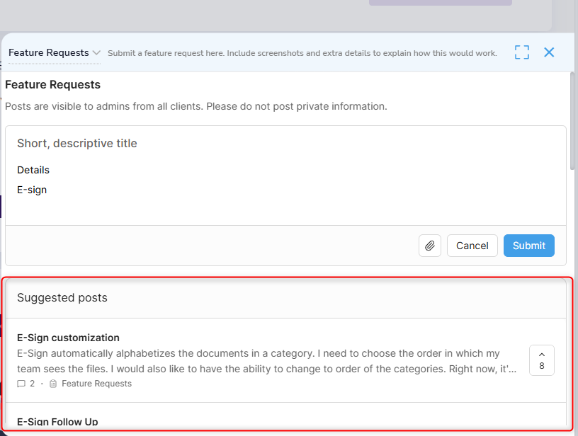 A popup window will appear where you can browse existing feedback or submit a new request.