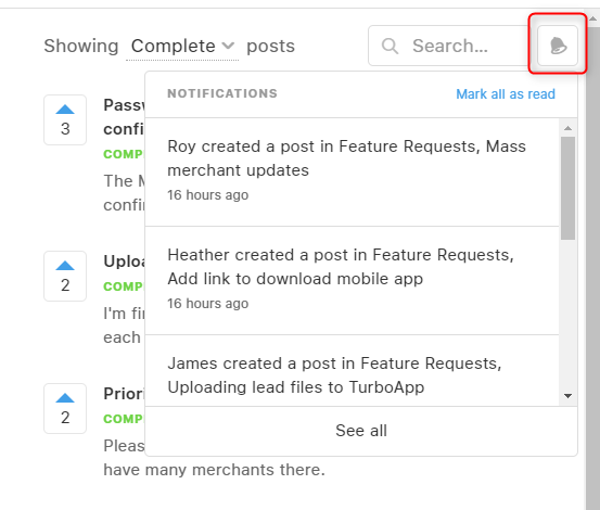 When a feature request is implemented or a bug is fixed, the related post is automatically updated to Complete. Users who voted for the post will receive a notification.