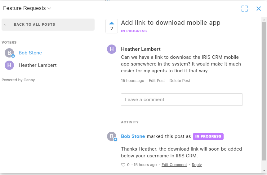 After submitting your post, other users can vote for the idea or add comments to contribute additional feedback.