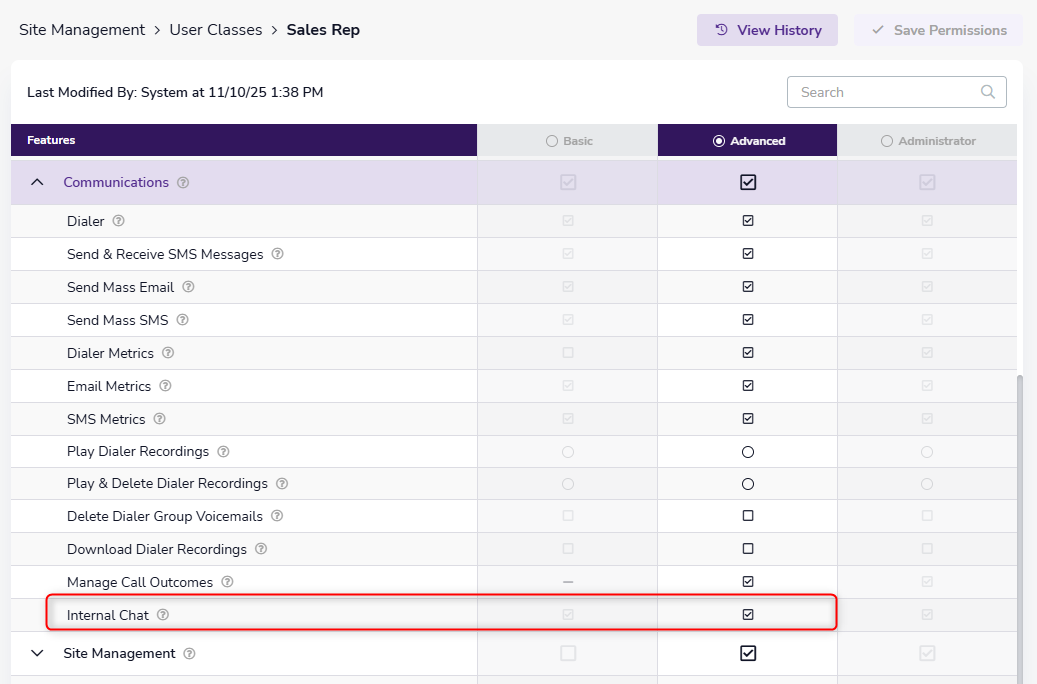 To use the chat feature, enable the "Internal Chat" user class permission for the appropriate user classes.