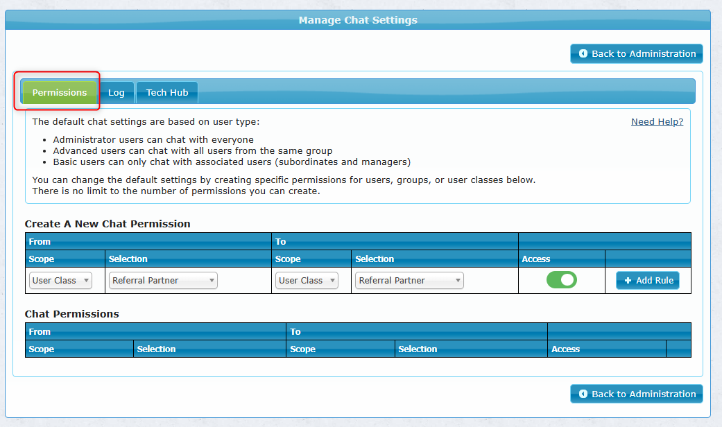 Chat permissions control who can communicate with whom inside the system. These rules determine whether users, user groups, or user classes can initiate chats with one another.