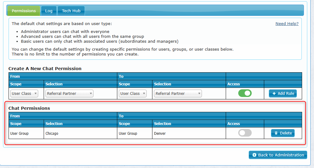 The newly created permission will appear in the Chat Permissions table. Example: blocking users in the Chicago group from chatting with users in the Denver group.