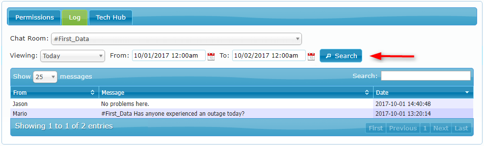 To view internal chat logs, go to Manage → Chat → Chat Logs, select a chat room and time range, then click Search.