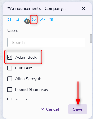To ban a user, open a public topic, click the Banned Users icon, select the user, and click Save.