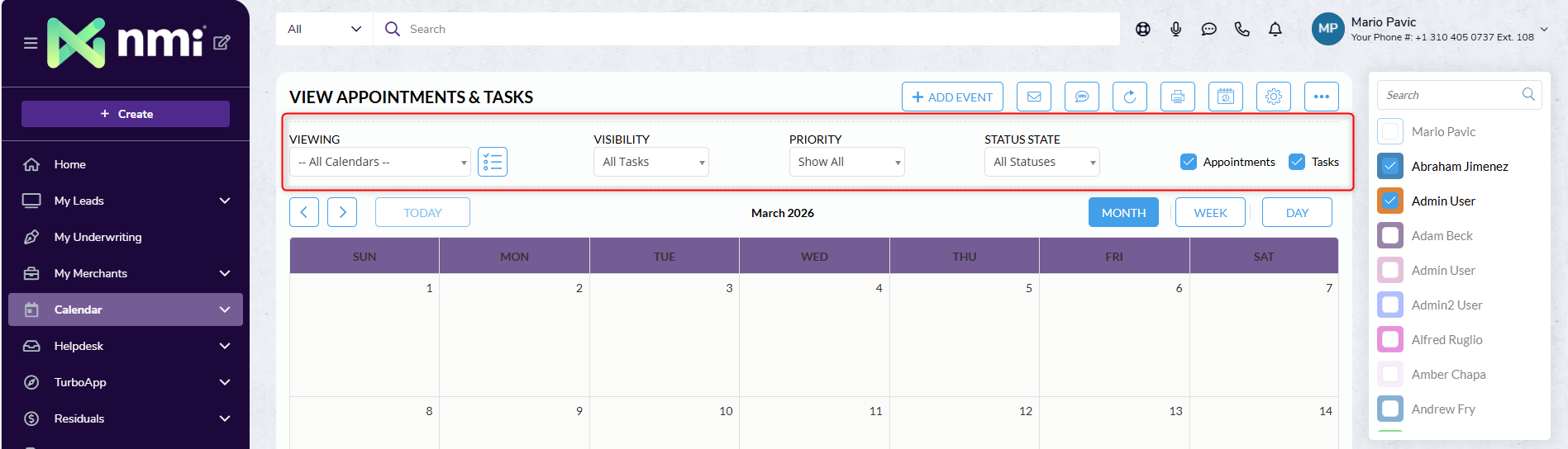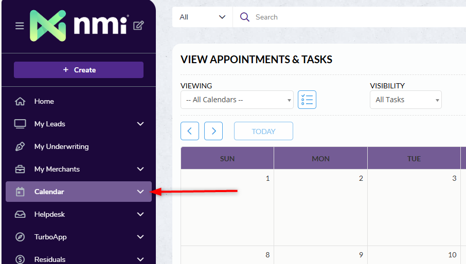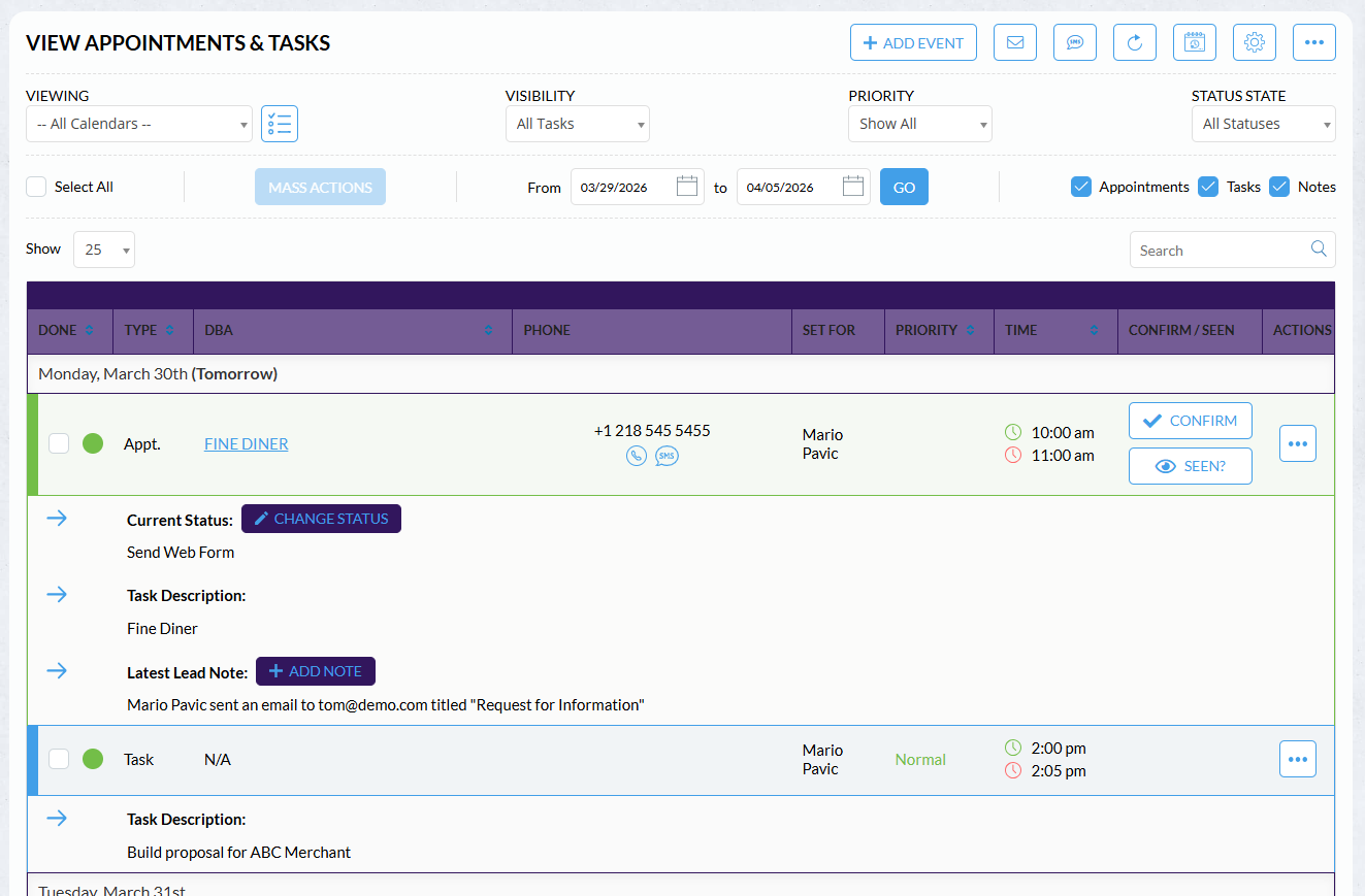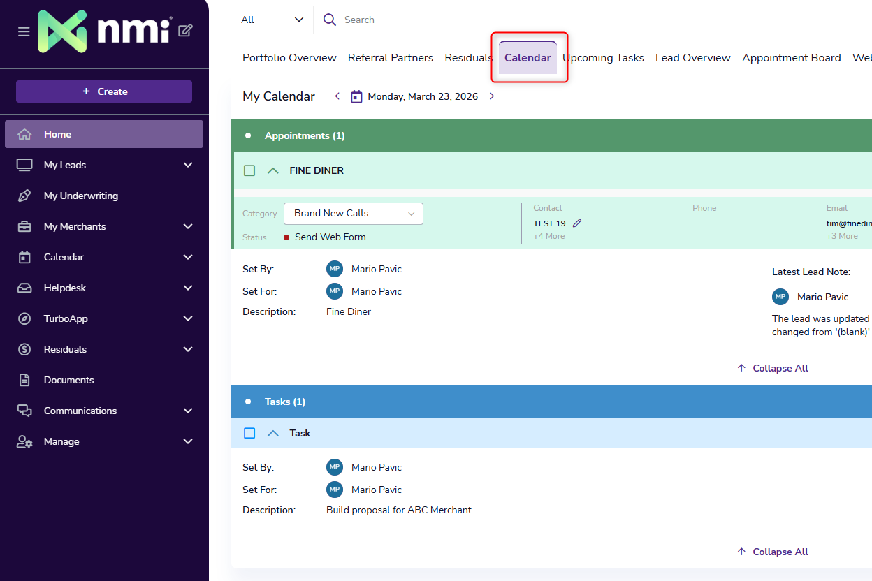 The Merchant Central Calendar provides a centralized space to manage tasks, appointments, and team schedules—helping you stay organized and keep work progressing efficiently. You can create tasks and appointments directly from the Calendar page or from within a Lead record.