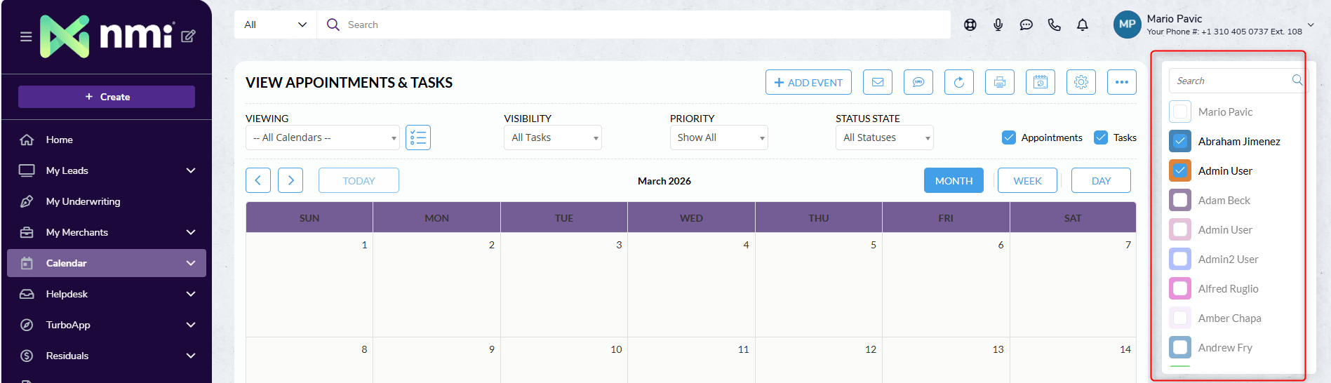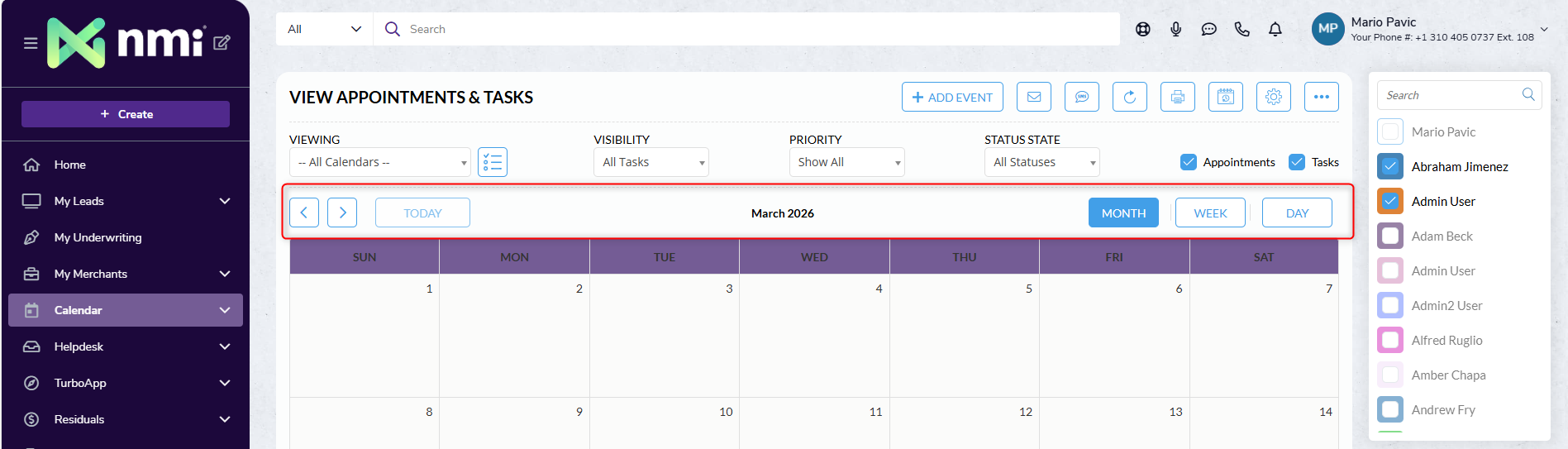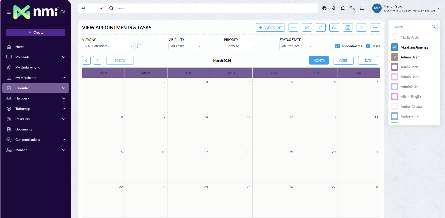 The Merchant Central Calendar provides a centralized space to manage tasks, appointments, and team schedules—helping you stay organized and keep work progressing efficiently. You can create tasks and appointments directly from the Calendar page or from within a Lead record.