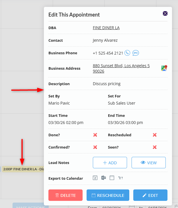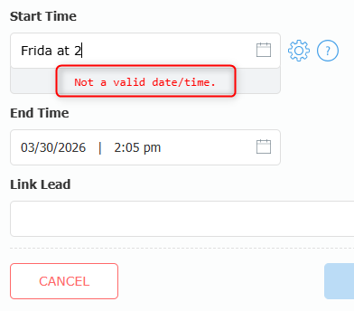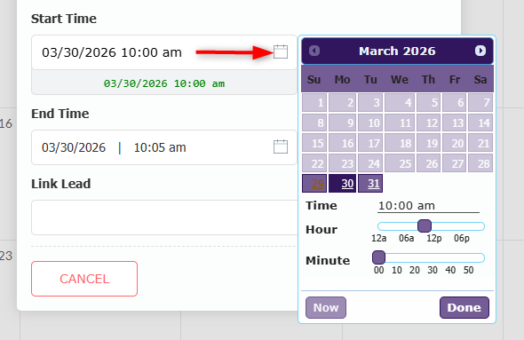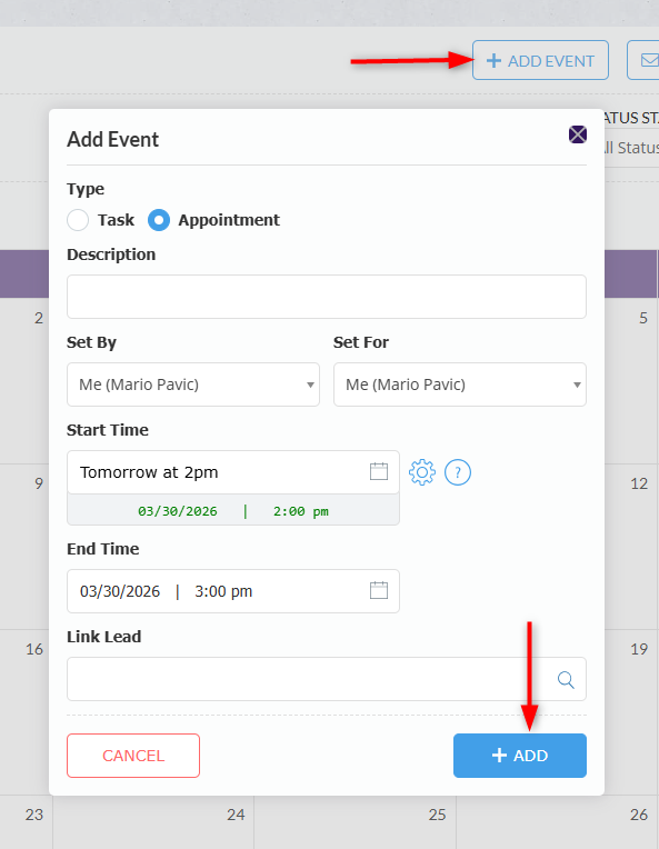 Calendar appointments must be linked to a lead, while calendar tasks can be linked to a lead if needed. To link an event to a lead, start typing the lead name in the Link Lead box and select it from the search results.