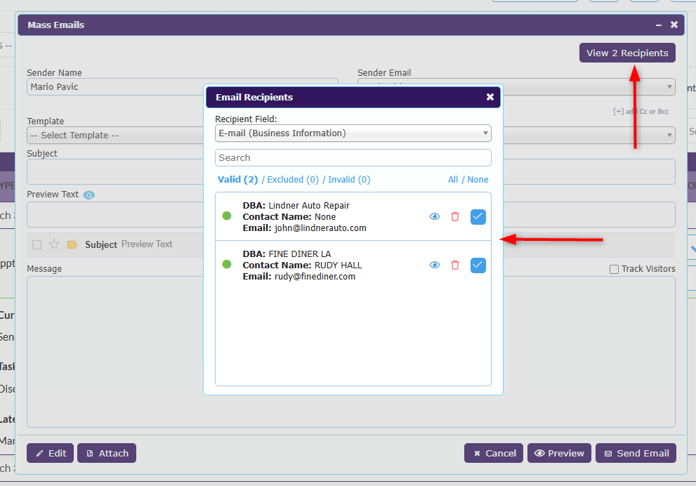 If you are sending a mass email, the email pop-up appears, allowing you to choose an email template or write a new message before sending it. To review recipients before sending, click View Recipients.