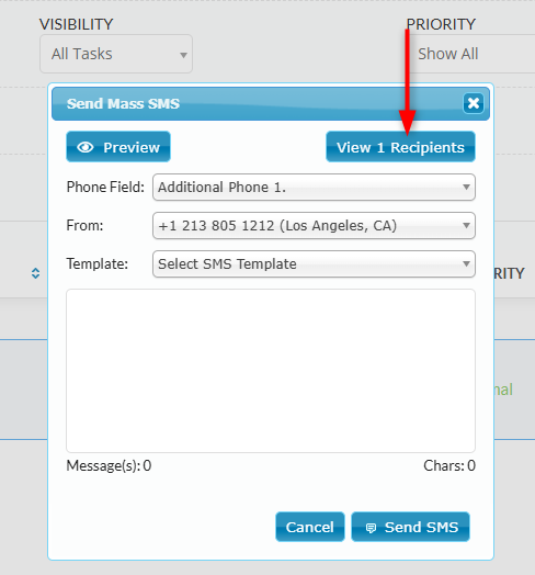 The Mass SMS action works similarly. You can choose an SMS template or write a new message, preview recipients, and send the SMS.