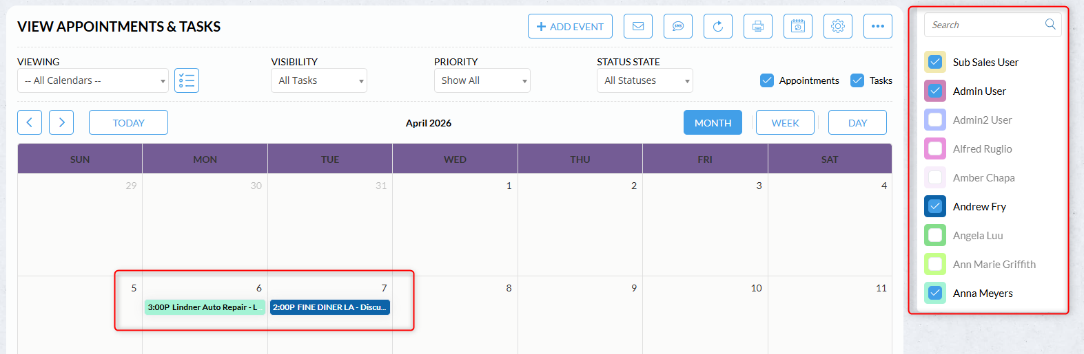 To add a task or appointment, click Add Event, choose the event type, enter the event details, and then click Add.