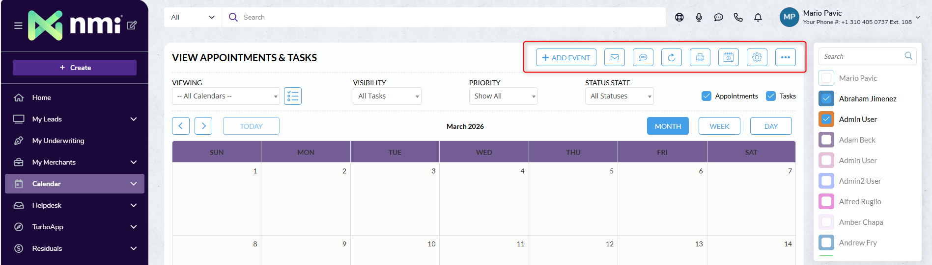 The bar below the action shortcuts lets you filter calendar events by user, priority, and other criteria.