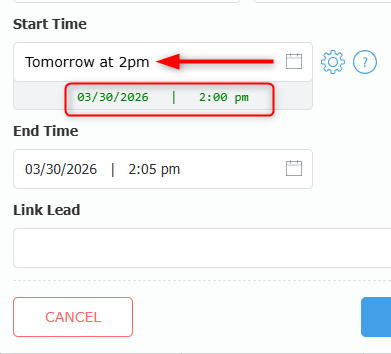 You can also enter natural language in the time field, such as "next Monday" or "tomorrow at 2pm". The field can recognize common scheduling phrases and automatically convert them into a date and time. When a term is recognized, the selected date and time appear in green.