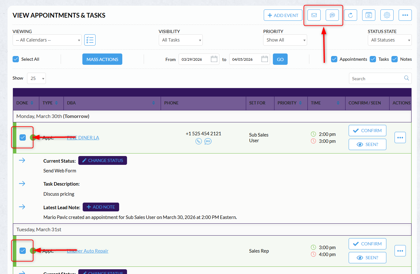 - Send mass emails or SMS messages to selected leads in the calendar (available in List View only)