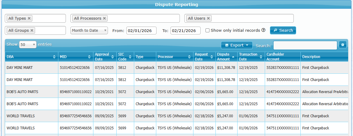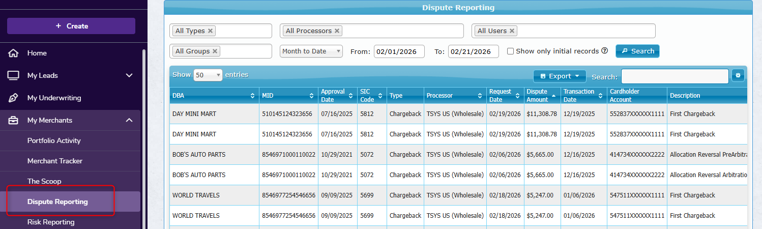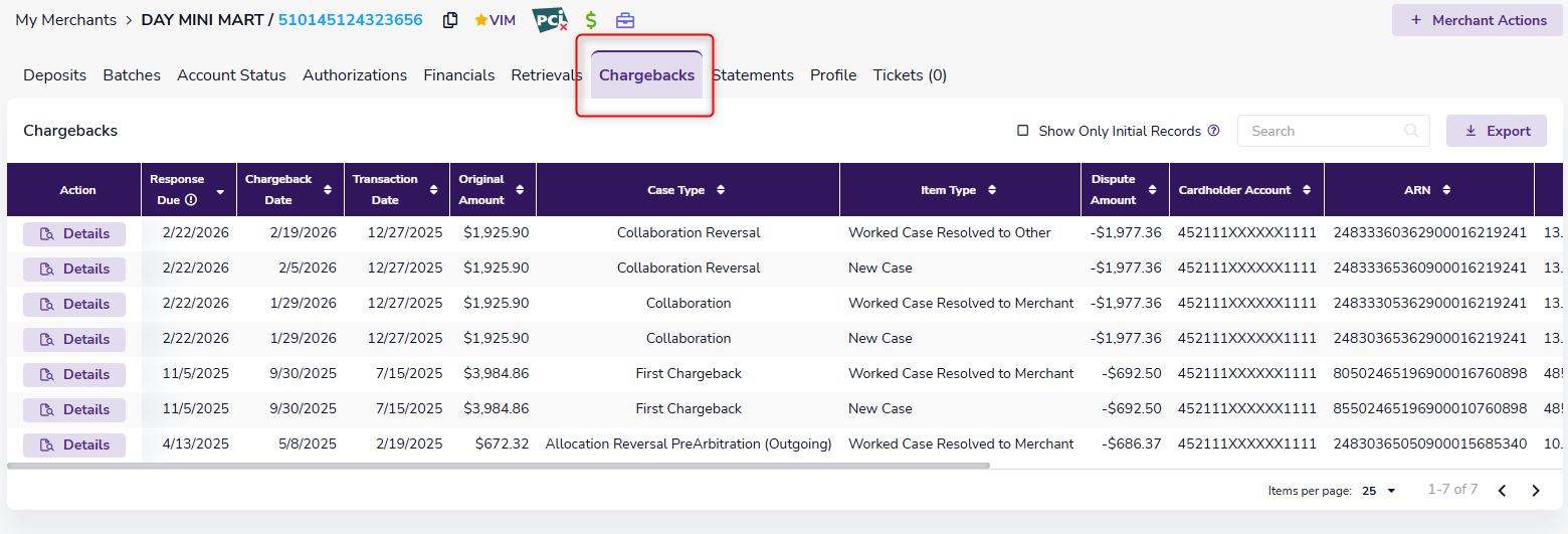 This helps you stay on top of disputes, support merchants who need guidance, and identify merchants with elevated chargeback volume.