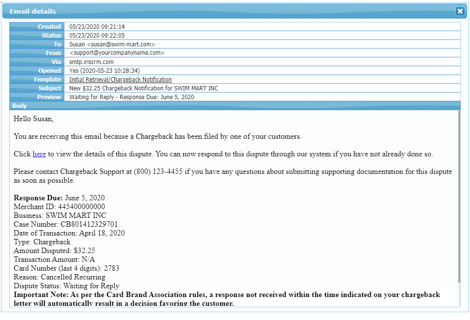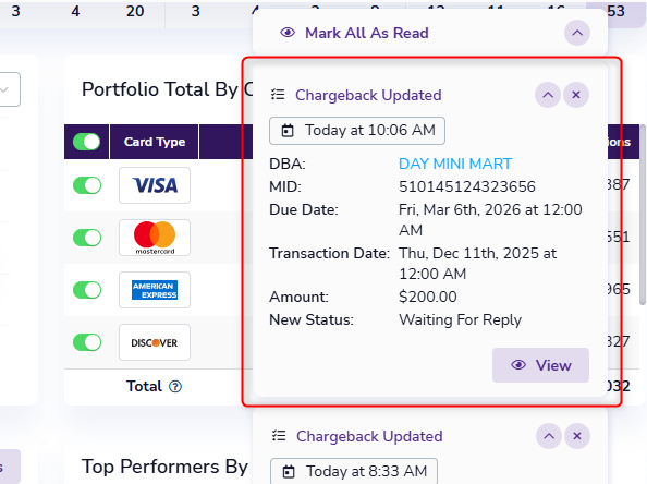 When a new dispute or retrieval is entered into Fiserv or TSYS FSP, Dispute Responder sends an instant notification to the merchant and logs the activity in Merchant Central.