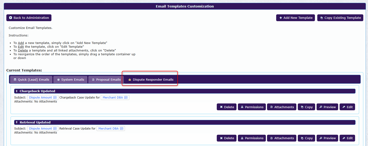 You can view the email templates used for follow-ups under the Dispute Responder Emails tab on the Email Templates page (Manage → E-Mail & SMS → Email Templates).