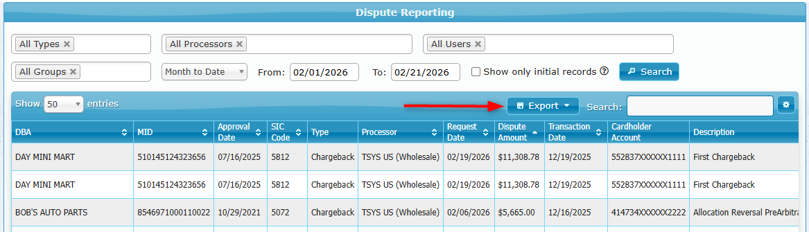To export dispute history, select Export on the dashboard.