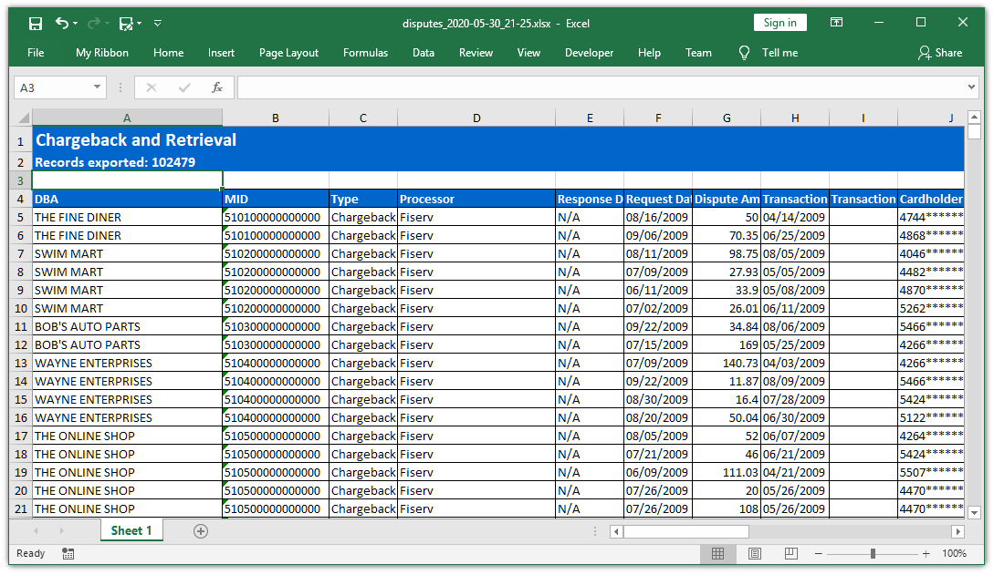 - Transaction date, dispute type (chargeback or retrieval), and amounts