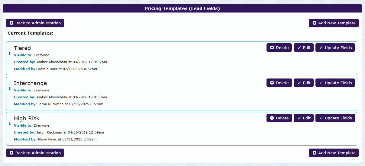 To access the pricing template configuration page, navigate to Manage → Leads → Pricing Templates. From there, you can: