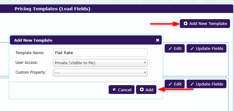 ℹ️If your site is configured with custom properties, you can also select a custom property in the Add New Template popup. If selected, the pricing template will appear only on leads where that custom property is selected.