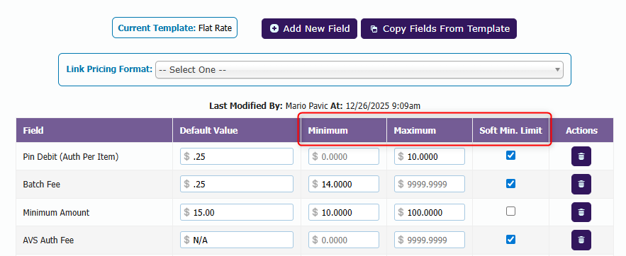 Pricing template fields can be configured with minimum and maximum values that users are allowed to enter.