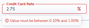 Minimum and maximum values are configured on the pricing template page and are available for Dollar, Percent, and Number fields. When configuring, you can use the following three settings: