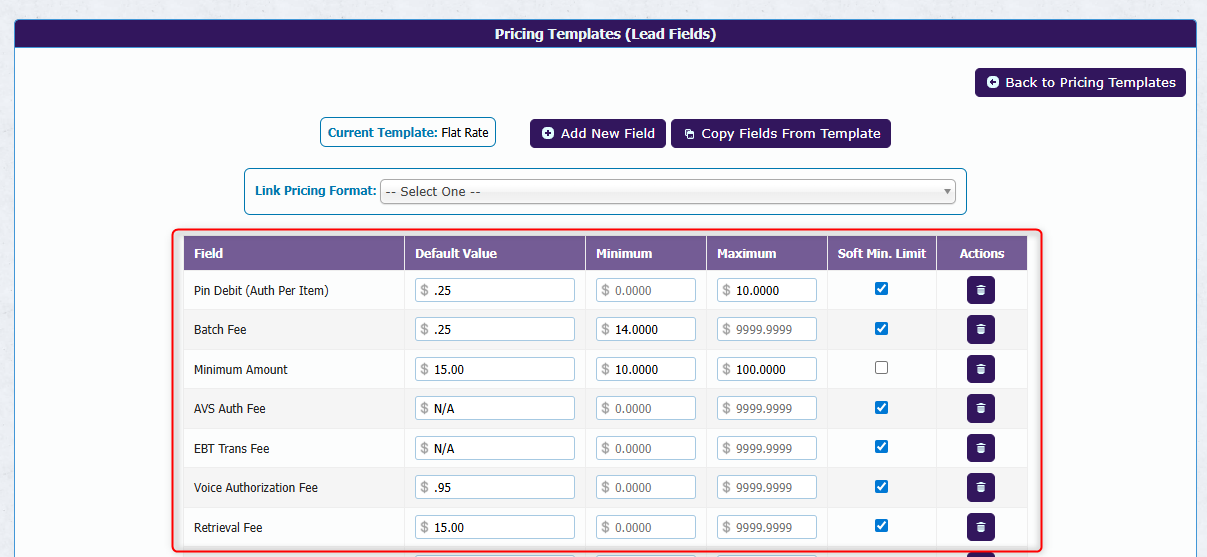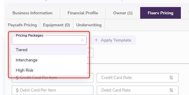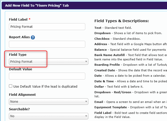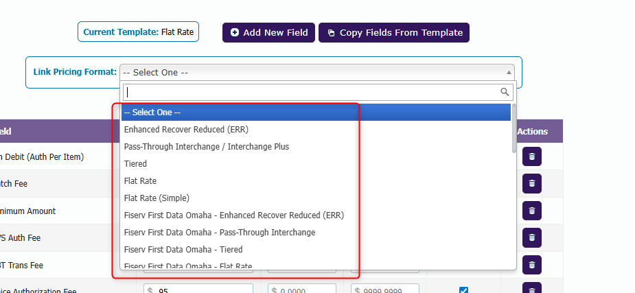 A Pricing Format dropdown displays the available pricing formats for your processors (such as tiered, interchange, and flat rate) and can be mapped to Merchant Central TurboApp. When boarding a merchant in the TurboApp, the selected pricing format automatically configures the Rates & Fees tab to display the appropriate pricing options for that format.