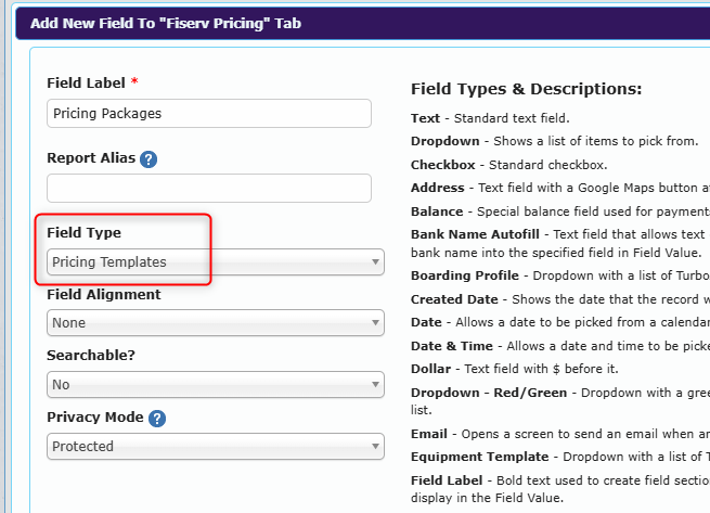 Enter a name and set Field Type to Pricing Templates (Dropdown).